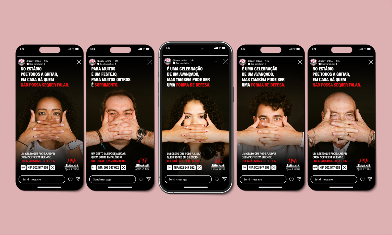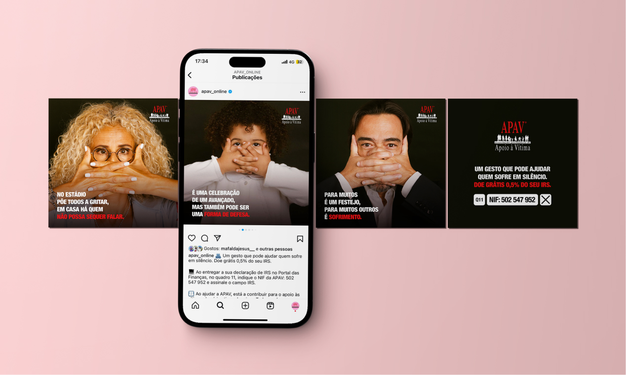 A 100% digital campaign in June 2024. Influencers, athletes, and fans replicated the gesture, this time to raise awareness and drive IRS consignations to APAV.